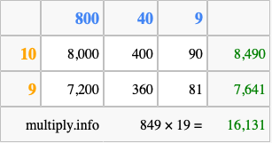 That's all there is to it! As you can see from the box above, the answer to 849 times 19 using the box method is 16,131.