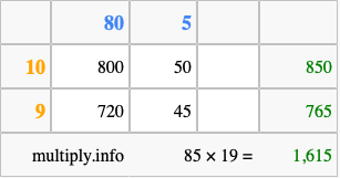 Finally, we add up all the sums we found in step 3 to get our final answer to 85 times 19.