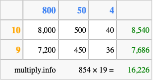Finally, we add up all the sums we found in step 3 to get our final answer to 854 times 19.