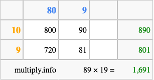 Below is an illustration showing you how to calculate 89 times 19 using the box method, using the instructions above.