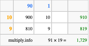 Below is an illustration showing you how to calculate 91 times 19 using the box method, using the instructions above.
