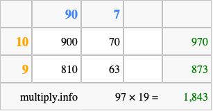 Below is an illustration showing you how to calculate 97 times 19 using the box method, using the instructions above.