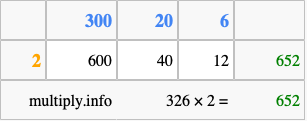 Below is an illustration showing you how to calculate 326 times 2 using the box method, using the instructions above.
