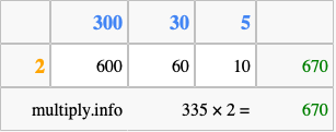 That's all there is to it! As you can see from the box above, the answer to 335 times 2 using the box method is 670.