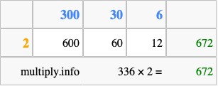 That's all there is to it! As you can see from the box above, the answer to 336 times 2 using the box method is 672.
