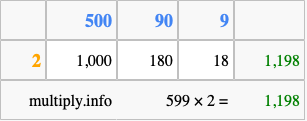 Below is an illustration showing you how to calculate 599 times 2 using the box method, using the instructions above.