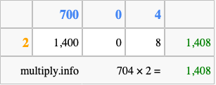 Below is an illustration showing you how to calculate 704 times 2 using the box method, using the instructions above.