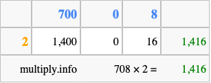 That's all there is to it! As you can see from the box above, the answer to 708 times 2 using the box method is 1,416.