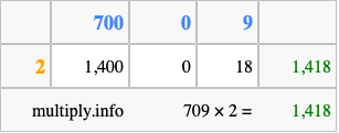 Below is an illustration showing you how to calculate 709 times 2 using the box method, using the instructions above.