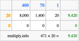 Below is an illustration showing you how to calculate 471 times 20 using the box method, using the instructions above.