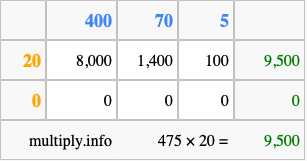 Below is an illustration showing you how to calculate 475 times 20 using the box method, using the instructions above.