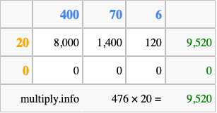 Below is an illustration showing you how to calculate 476 times 20 using the box method, using the instructions above.