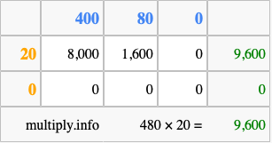 Below is an illustration showing you how to calculate 480 times 20 using the box method, using the instructions above.