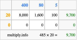 Below is an illustration showing you how to calculate 485 times 20 using the box method, using the instructions above.