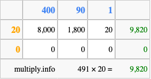 Below is an illustration showing you how to calculate 491 times 20 using the box method, using the instructions above.