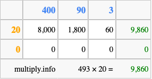 Below is an illustration showing you how to calculate 493 times 20 using the box method, using the instructions above.