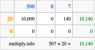 Below is an illustration showing you how to calculate 507 times 20 using the box method, using the instructions above.