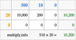 Below is an illustration showing you how to calculate 510 times 20 using the box method, using the instructions above.
