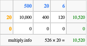 Below is an illustration showing you how to calculate 526 times 20 using the box method, using the instructions above.