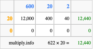 That's all there is to it! As you can see from the box above, the answer to 622 times 20 using the box method is 12,440.