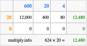 Below is an illustration showing you how to calculate 624 times 20 using the box method, using the instructions above.