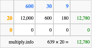 That's all there is to it! As you can see from the box above, the answer to 639 times 20 using the box method is 12,780.