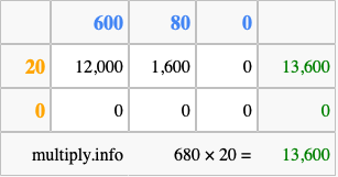 That's all there is to it! As you can see from the box above, the answer to 680 times 20 using the box method is 13,600.