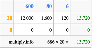 Below is an illustration showing you how to calculate 686 times 20 using the box method, using the instructions above.