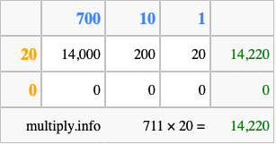 That's all there is to it! As you can see from the box above, the answer to 711 times 20 using the box method is 14,220.