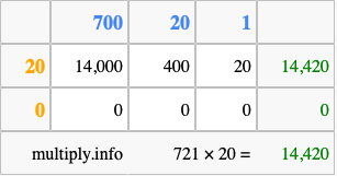 That's all there is to it! As you can see from the box above, the answer to 721 times 20 using the box method is 14,420.