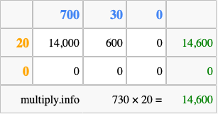 That's all there is to it! As you can see from the box above, the answer to 730 times 20 using the box method is 14,600.