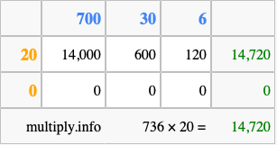Below is an illustration showing you how to calculate 736 times 20 using the box method, using the instructions above.