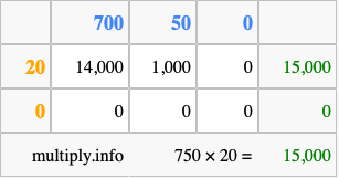 That's all there is to it! As you can see from the box above, the answer to 750 times 20 using the box method is 15,000.
