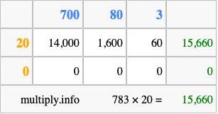 Finally, we add up all the sums we found in step 3 to get our final answer to 783 times 20.