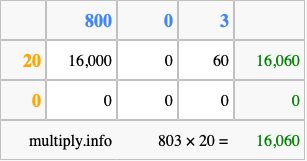That's all there is to it! As you can see from the box above, the answer to 803 times 20 using the box method is 16,060.
