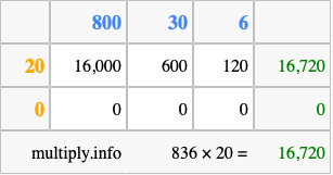 That's all there is to it! As you can see from the box above, the answer to 836 times 20 using the box method is 16,720.
