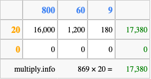 Finally, we add up all the sums we found in step 3 to get our final answer to 869 times 20.