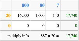 Finally, we add up all the sums we found in step 3 to get our final answer to 887 times 20.