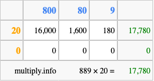 Below is an illustration showing you how to calculate 889 times 20 using the box method, using the instructions above.