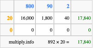Below is an illustration showing you how to calculate 892 times 20 using the box method, using the instructions above.