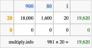 That's all there is to it! As you can see from the box above, the answer to 981 times 20 using the box method is 19,620.