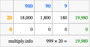 That's all there is to it! As you can see from the box above, the answer to 999 times 20 using the box method is 19,980.