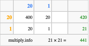 That's all there is to it! As you can see from the box above, the answer to 21 times 21 using the box method is 441.