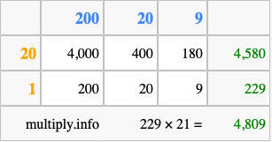 That's all there is to it! As you can see from the box above, the answer to 229 times 21 using the box method is 4,809.