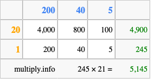 Finally, we add up all the sums we found in step 3 to get our final answer to 245 times 21.