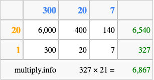Finally, we add up all the sums we found in step 3 to get our final answer to 327 times 21.