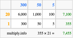Finally, we add up all the sums we found in step 3 to get our final answer to 355 times 21.