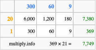 That's all there is to it! As you can see from the box above, the answer to 369 times 21 using the box method is 7,749.