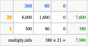 That's all there is to it! As you can see from the box above, the answer to 380 times 21 using the box method is 7,980.