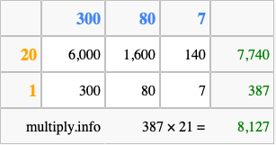 Finally, we add up all the sums we found in step 3 to get our final answer to 387 times 21.